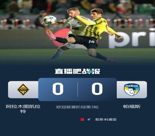 德拉戈米爾進(jìn)球被吹,阿拉德射中立柱,最終阿拉木圖凱拉特0-0帕福斯。